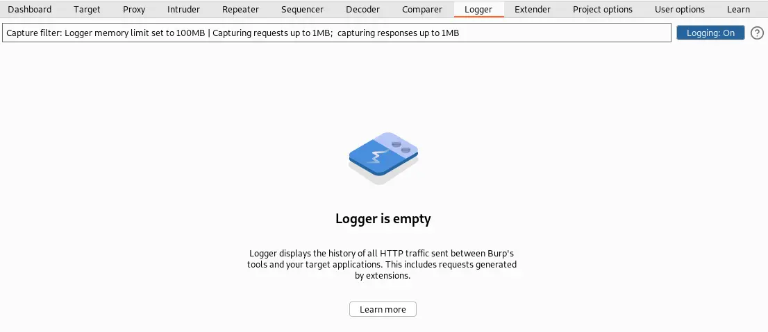 Logger displays all the communication information between your BurpSuite tool set and the target website.