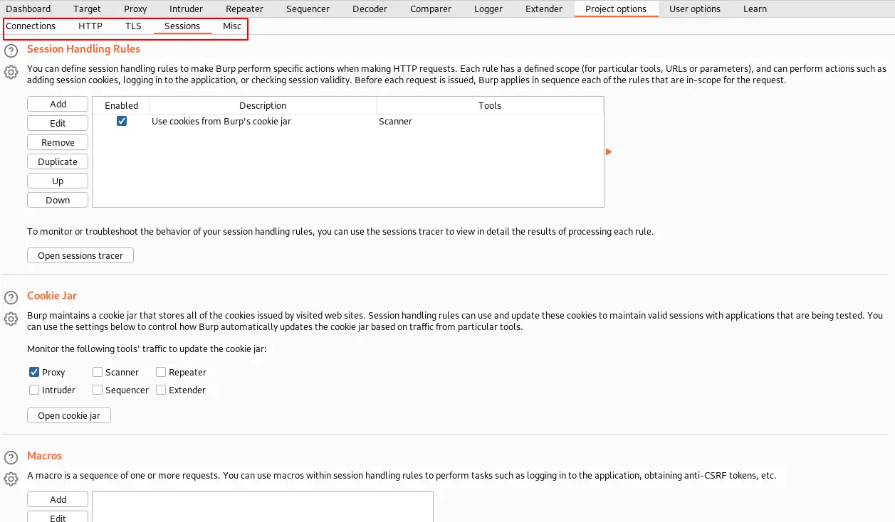 Project options provide you with a lot more benefits to tweak session handling rules, how and where the cookies are maintained, Macros to repeat a sequence of actions based on rules, HTTP communication preferences, etc.