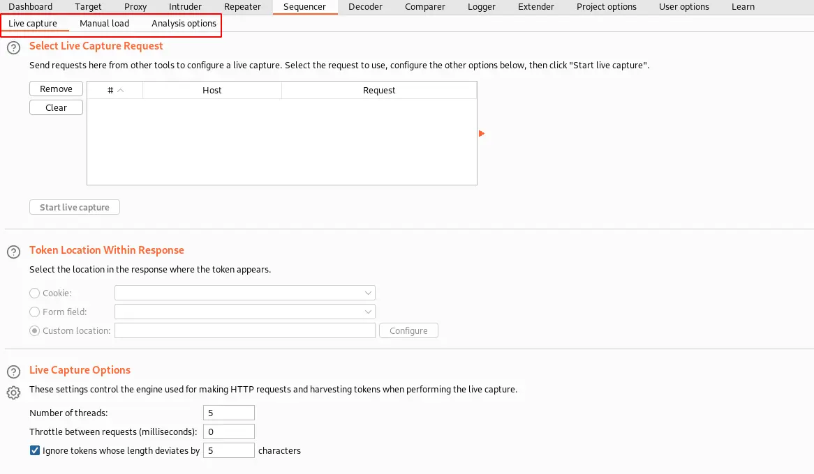 Live capture helps you to capture each request directly by interacting with the web server. Whereas Manual load is a place where you can give samples of the tokens you have collected for analyzing the strength of the tokens.