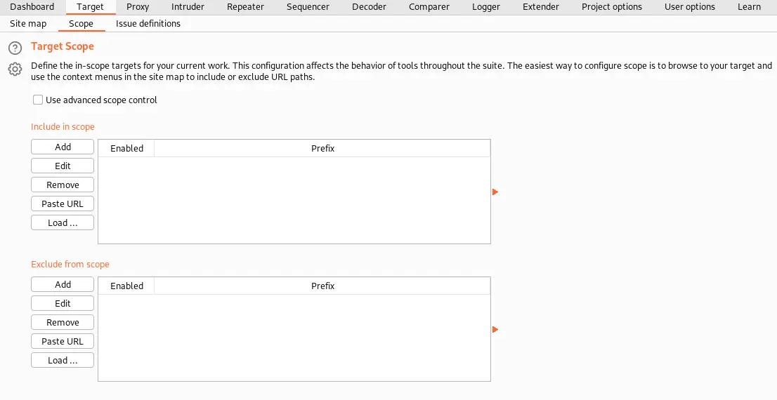 The target tab consists of three items, site map, scope, and issue definitions.