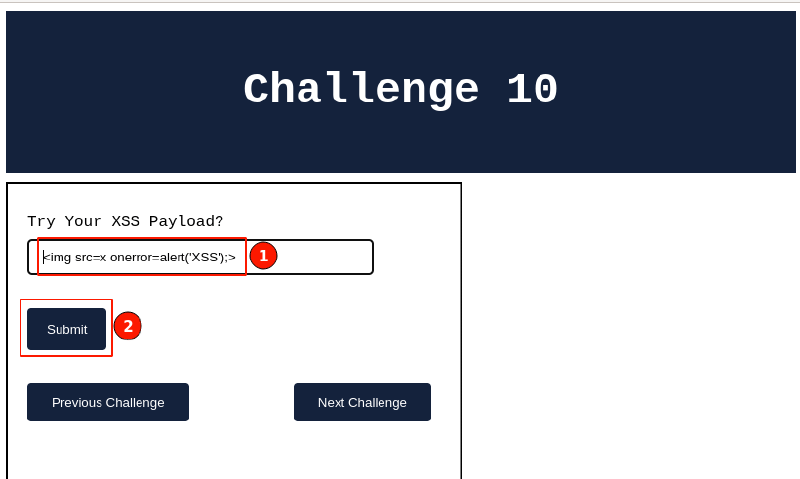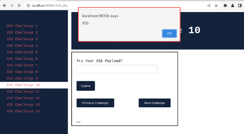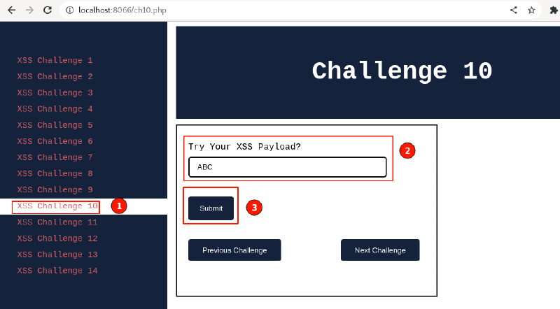 Let’s get started with XSS Challenge 10. Visit: http://localhost:8066 and ensure it’s accessible, then navigate to “XSS Challenge 10“.