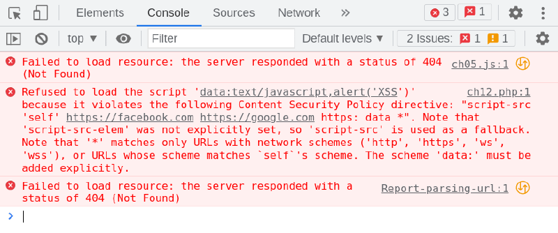 Content-Security-Policy: script-src 'self' https://facebook.com https://google.com https: data *; child-src 'none'; report-uri /Report-parsing-url;This is because the CSP policy explicitly disallows scripts to be loaded from the “data:” scheme, except for the page’s own origin (i.e., ‘*self*‘ same domain).