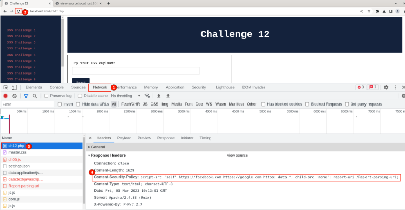 Select the “ch12.php” page and scroll to the “Response Headers” section. Observe, the Content-Security-Policy header which was set by the application server.