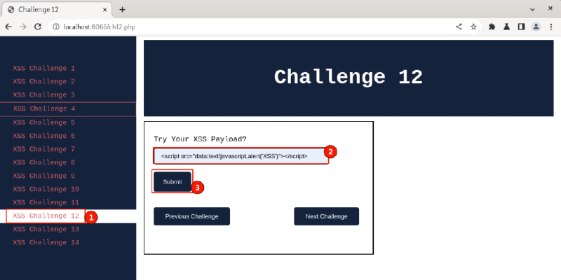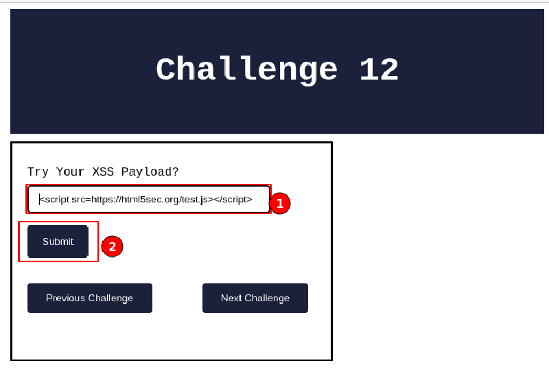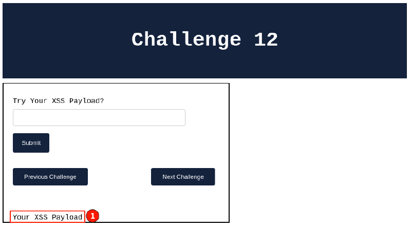 Visit the XSS Challenge 12, paste the above payload in the input form field, and click on the “Submit” button.