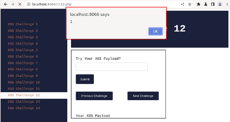 Once your Kurukshetra XSS lab environment is up and running, Visit http://localhost:8066 and navigate to “XSS Challenge 12“.