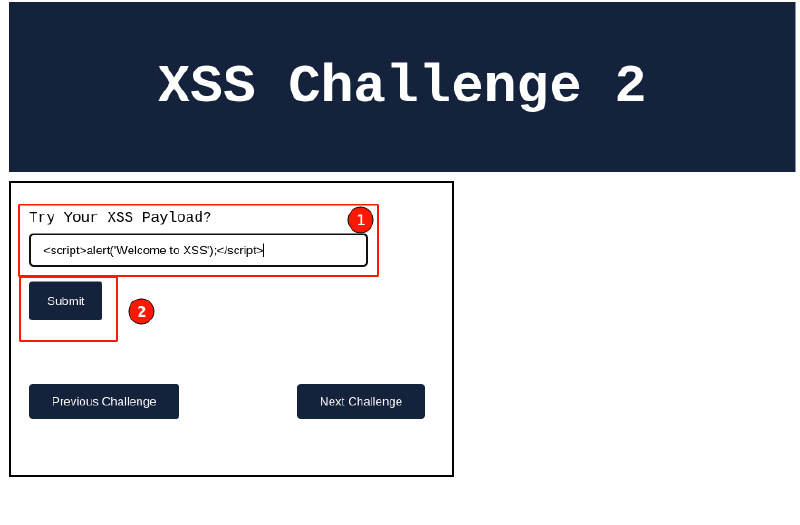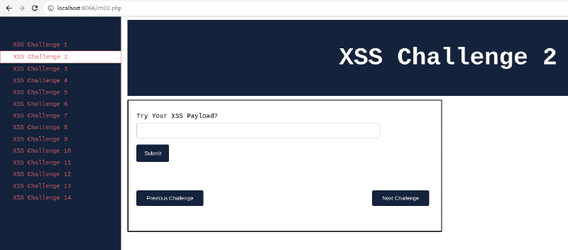 Post setting up the lab, visit http://localhost:8066. The application should be loaded as shown below and Navigate to “XSS Challenge 2.”