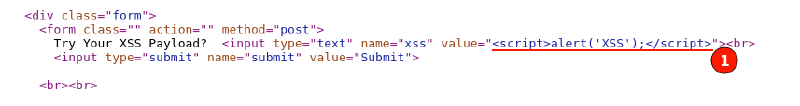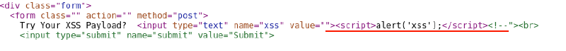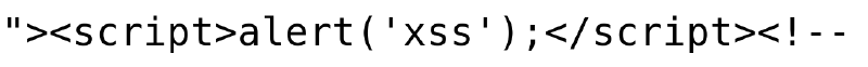 - Closing the HTML input form tag, injecting our classic XSS payload, and commenting out the rest of the code.