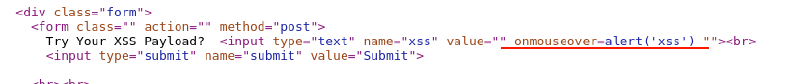 Observe that the double quote has closed the value field, then appended the HTML attribute element for the input tag with the “onmouseover” event along with the javascript code, then closed the double quote to further align with the HTML code.