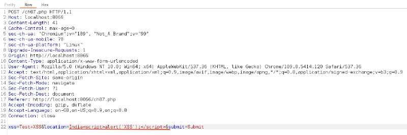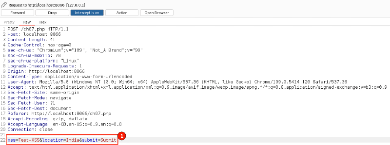 Observe at the bottom of the request the “xss”, “location” and “submit” params are being passed to the server.