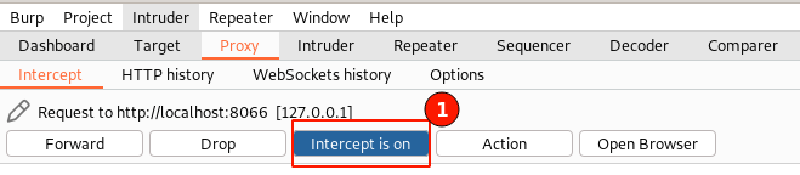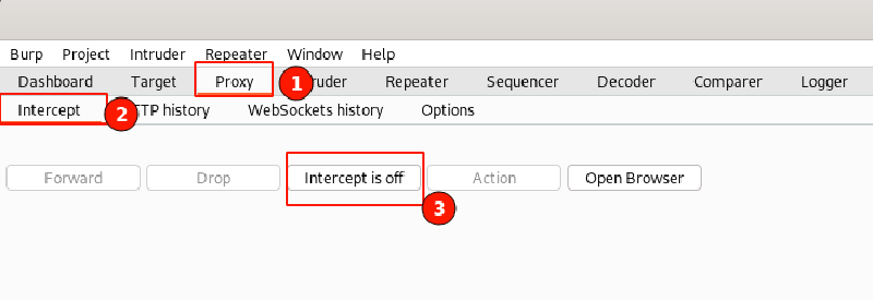 Next, toggle off the “Intercept is on” button to disable the request interception for now. Immediately switch back to the web browser.