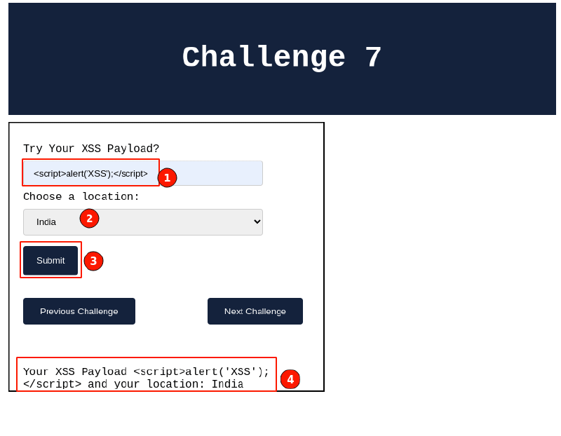 Coming to XSS Challenge 7, an input field is given to key in the text and a drop-down menu option needs to be selected before clicking on the “Submit” button.