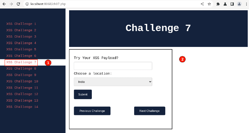 Post setting up the lab visit http://localhost:8066 and ensure it’s accessible, then navigate to “XSS Challenge 7”.