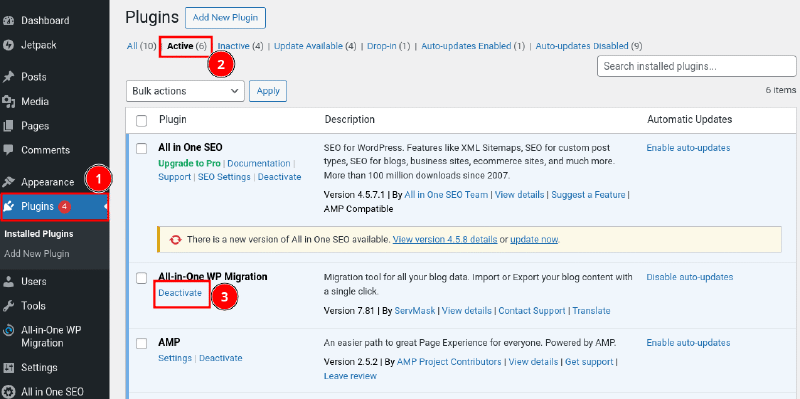 Navigate to the “Plugins” section in the dashboard, select the “Active” plugins list, and click on the “Deactivate” link for all the plugins that are not very useful to you.