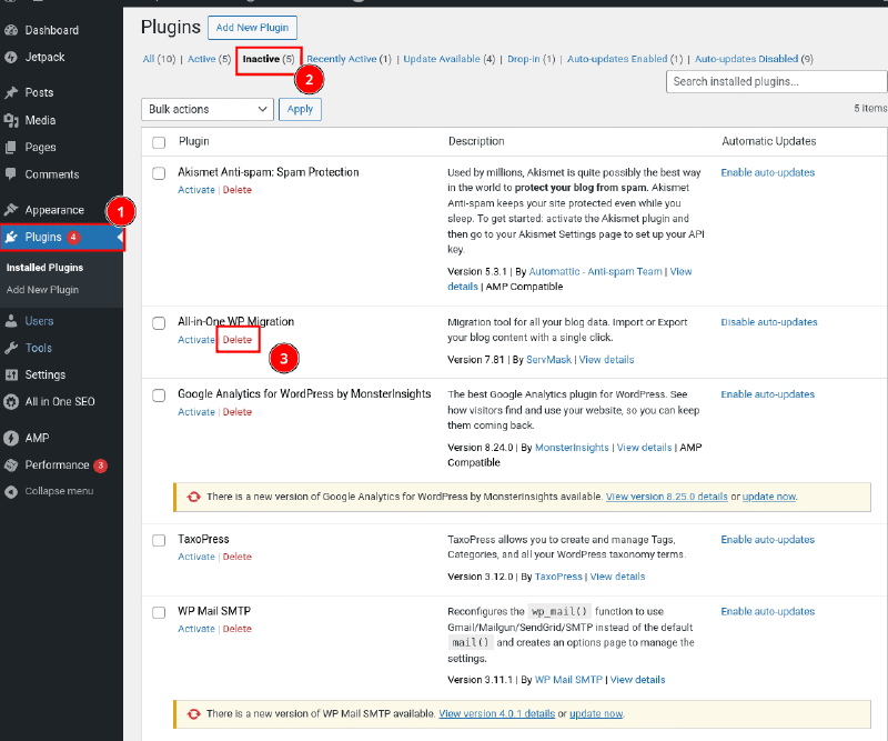 If you think the plugin is no longer needed, You can go ahead and delete it completely. Click on the “Inactive” filter from the “Plugins” dashboard and click “Delete”.