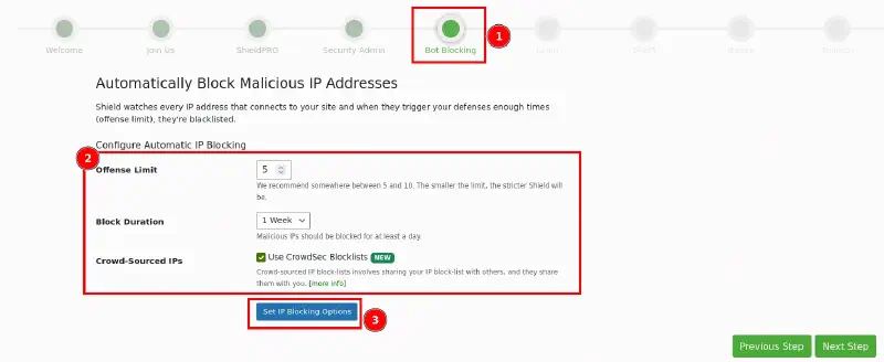 To activate it, click on “Set IP Blocking Options”. After 5 malicious attempts, the IP address will be blocked for 1 Week.