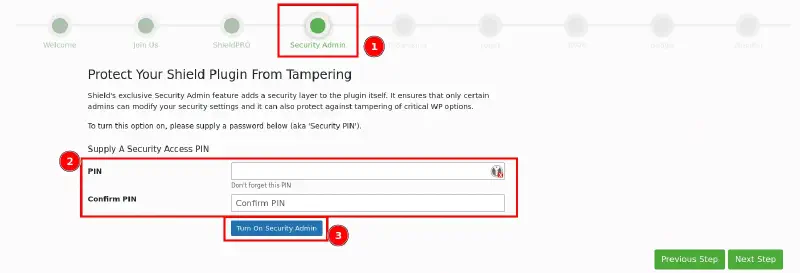 The application displays the form to set up a plugin PIN in the “Security Admin” section. This would be an added layer of protection for admins, ensuring only the authorized person can access or modify the security setting.