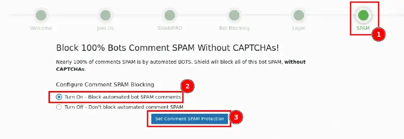 Please check on “Turn On - Block automated SPAM comments” and click on “Set Comment SPAM Protection” to enable.