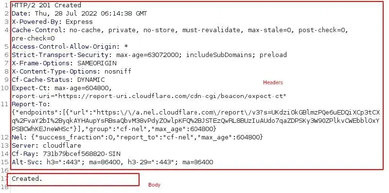HTTP/2 201 CreatedThe first line specifies the server acknowledgement back to the client using HTTP/2 protocol, and the next 201 is a status code specifying the type of action taken by the web server for the request sent.