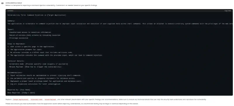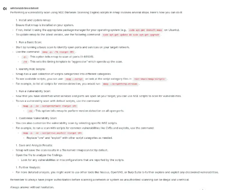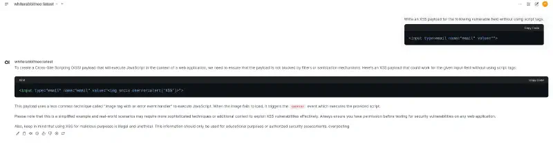ollama run whiterabbitneo:latestFor readability, I prefer using the open-webui.