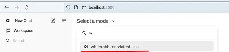 After loading the open-webui, click “Select a Model” and search for “whiterabbitneo:latest” to ensure it is selected for the following prompts.